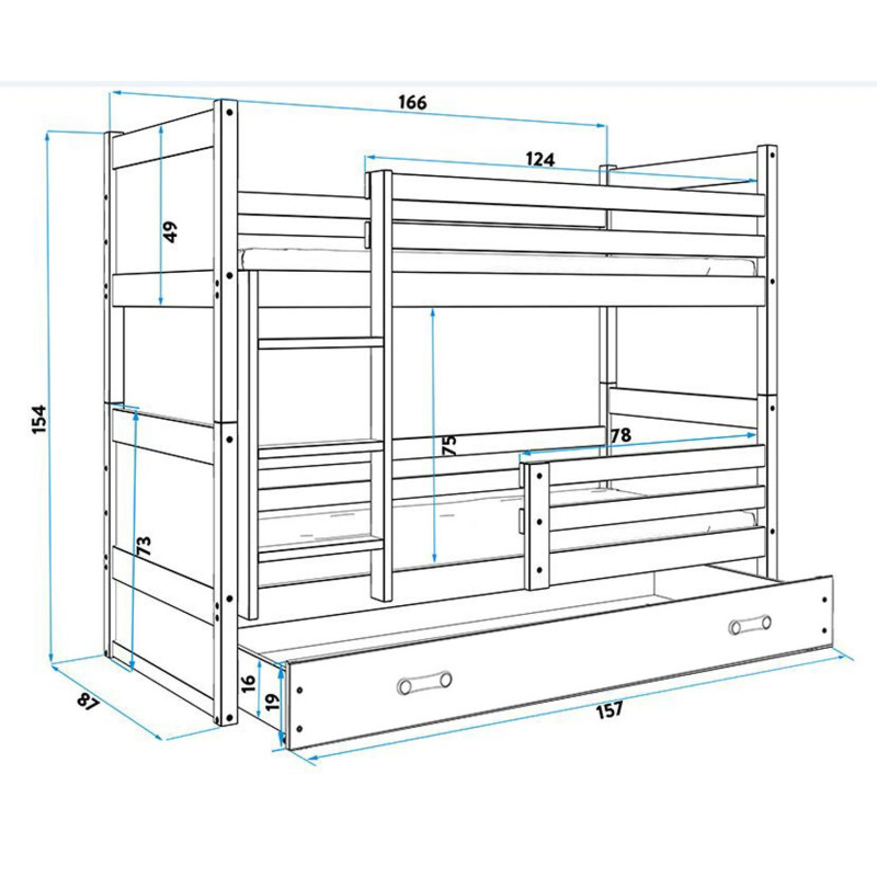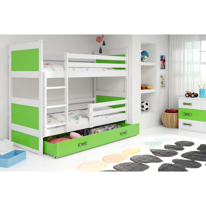 Dětská patrová postel RICO 160x80 cm. Postel je vyrobena z masivní borovice. Díky praktickému úložnému prostoru vyřešíte problémy s uschováním všech malých nezbytností. S ohledem na děti je veškerý sortiment vyroben z ekologicky nezávadného materiálu. Žebřík lze namontovat vpravo i vlevo. - 100% ochrana pro vaše dítě díky bezpečnostní zábraně. - Úložný prostor. - Pěnové matrace, které jsou vysoce hypoalergenní s lehce snímatelným potahem, který lze prát v pračce. Matrace je univerzální, vzdušná a velmi dobře odvádí vlhkost. Výška matrace je 7 cm. Údržba: Povrch nábytku utřete do čista měkkým hadříkem. Vyhněte se použití chemikálií.