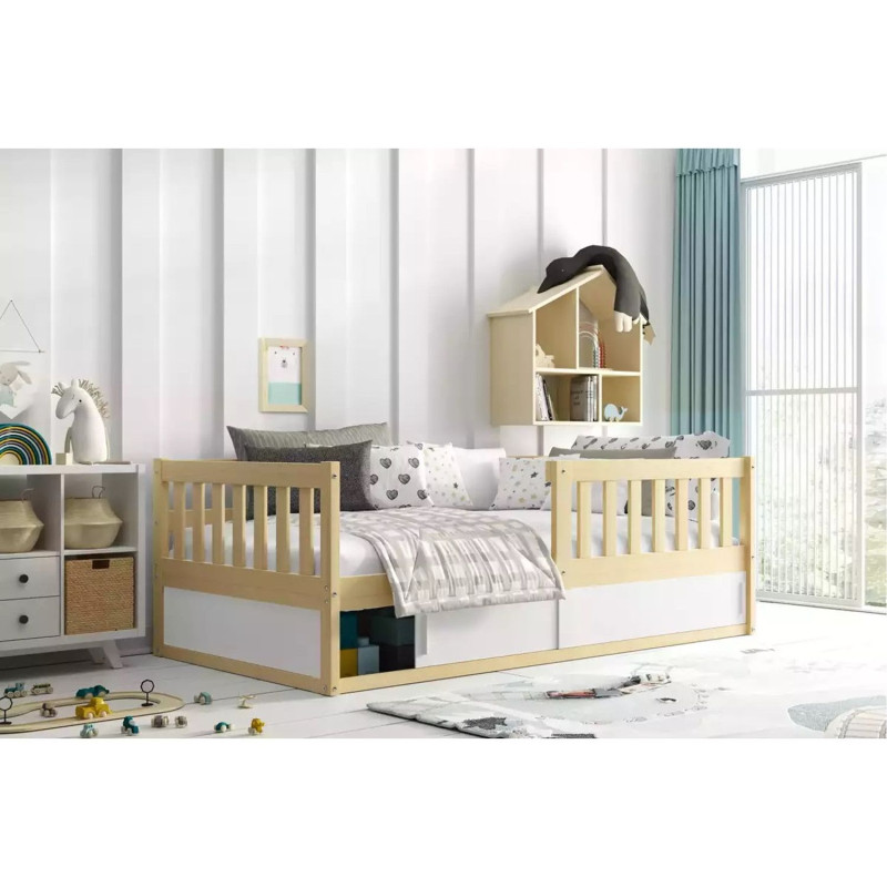 Dětská postel SMART 80x160 cm z masivu borovice. Postel obsahuje ochrannou zábranu. Díky praktickému úložnému prostoru vyřešíte problémy s uschováním všech malých nezbytností. S ohledem na děti je veškerý sortiment vyroben ekologicky. Je tedy vyloučeno při kontaktu dítěte s nábytkem požití toxických nebo zdraví škodlivých látek. - moderní postel vyrobená z masivu borovice - 100% ochrana pro vaše dítě díky bezpečnostní zábraně - rošt vyrobený ze dřeva - úložný prostor Matrace: Pěnová matrace, která je vysoce hypoalergenní s lehce snímatelným potahem, potah lze prát v pračce. Matrace je univerzální, vzdušná a velmi dobře odvádí vlhkost. Výška matrace je 7 cm. Údržba: Povrch nábytku utřete do čista měkkým hadříkem. Vyhněte se použití chemikálií.