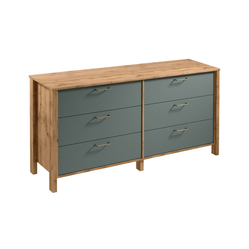 Komoda INDIGO K6S. Komoda K6S se šesti prostornými, plnovýsuvnými zásuvkami, což výrazně usnadňuje přístup k věcem uvnitř. Povrch pracovní desky umožňuje vystavit dekorace. Kovové rukojeti v matně zlaté barvě dodávají eleganci. Přírodní barvy teplého dekoru dub Wotan na korpusu nábytku v kombinaci s jednobarevnou béžovou nebo zelenou na výběr dělají kolekci přirozeně krásnou. - použití kvalitních materiálů - zajímavé provedení - snadná montáž Údržba: Povrch nábytku utřete do čista měkkým hadříkem. Vyhněte se použití chemikálií.