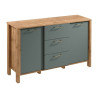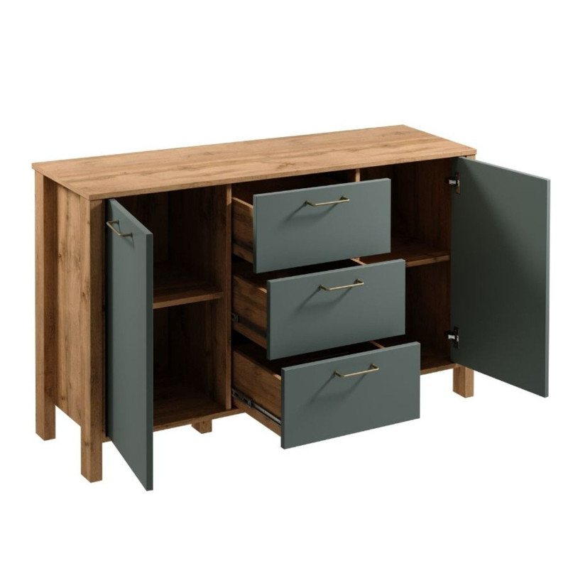 Komoda INDIGO K2D3S. Komoda K2D3S se skvěle hodí na drobnosti a dokumenty. Zásuvky mají funkci plného výsuvu, což výrazně usnadňuje přístup k předmětům uvnitř. Dvě prostorné skříně s poličkou nabízející další úložný prostor. Vysoké nohy umožňují snadný přístup. Kovové rukojeti v matně zlaté barvě dodávají eleganci. Přírodní barvy teplého dekoru dub Wotan na korpusu nábytku v kombinaci s jednobarevnou béžovou nebo zelenou na výběr dělají kolekci přirozeně krásnou. - použití kvalitních materiálů - zajímavé provedení - snadná montáž Údržba: Povrch nábytku utřete do čista měkkým hadříkem. Vyhněte se použití chemikálií.
